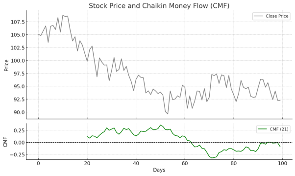 - Divergence → Price rising but CMF falling may warn of a potential reversal
