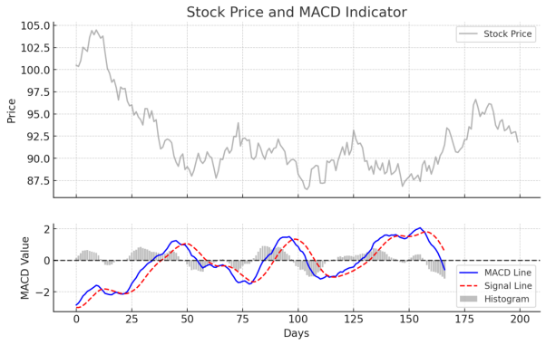 Here’s a chart showing how the MACD Indicator moves with stock prices. The MACD Line (blue) and Signal Line (red, dashed) generate buy and sell signals when they cross. The Histogram (gray bars) represents the strength of momentum. When the histogram turns positive, it suggests bullish momentum; when negative, it signals bearish momentum.
