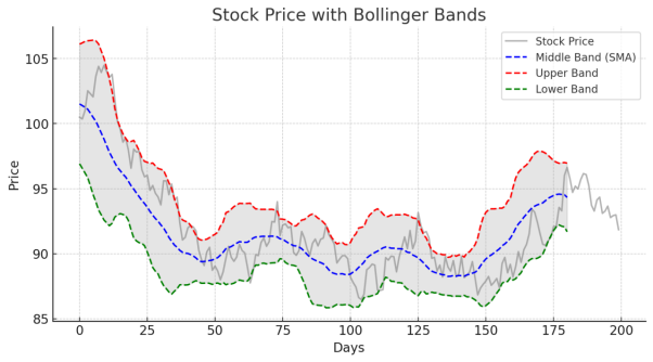 Here’s a chart showing how Bollinger Bands behave with stock price movements. The Middle Band (blue, dashed) represents the average price, while the Upper (red) and Lower (green) Bands define volatility levels. When the stock price touches the Upper Band, it may be overbought, and when it reaches the Lower Band, it may be oversold. The gray-shaded area shows price fluctuations within the bands.
